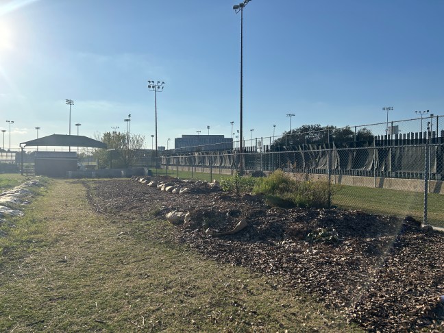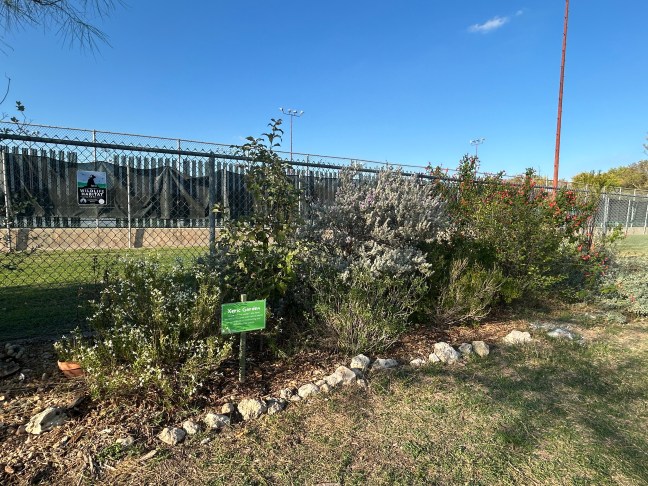 Along the fenceline, we planted native plants that require little minimal watering as well as pollinator and bird friendly plants. Some plants include Red Yucca, Salvias, Turk’s Cap, Coral Honeysuckle, and Gregg’s Mistflower.