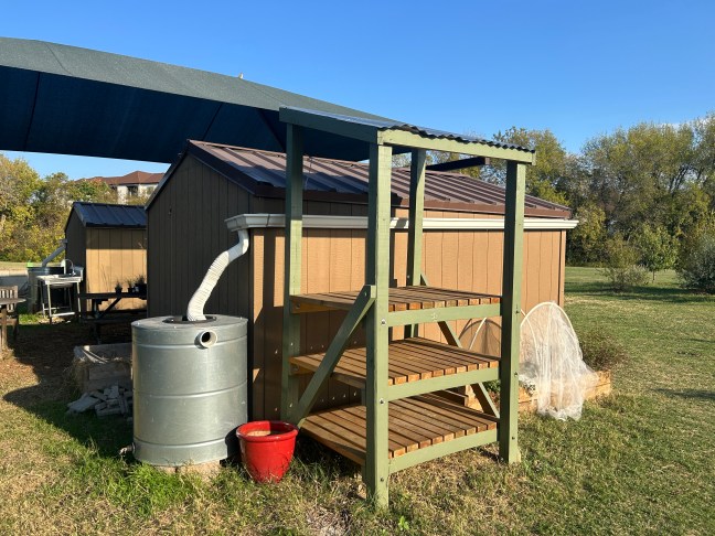 We have two rainwater catchment bins from Texas Metal Tanks that collects rainwater running down our sheds. Each can hold up to 90 gallons of water.